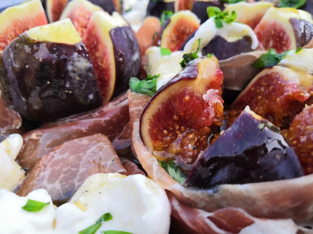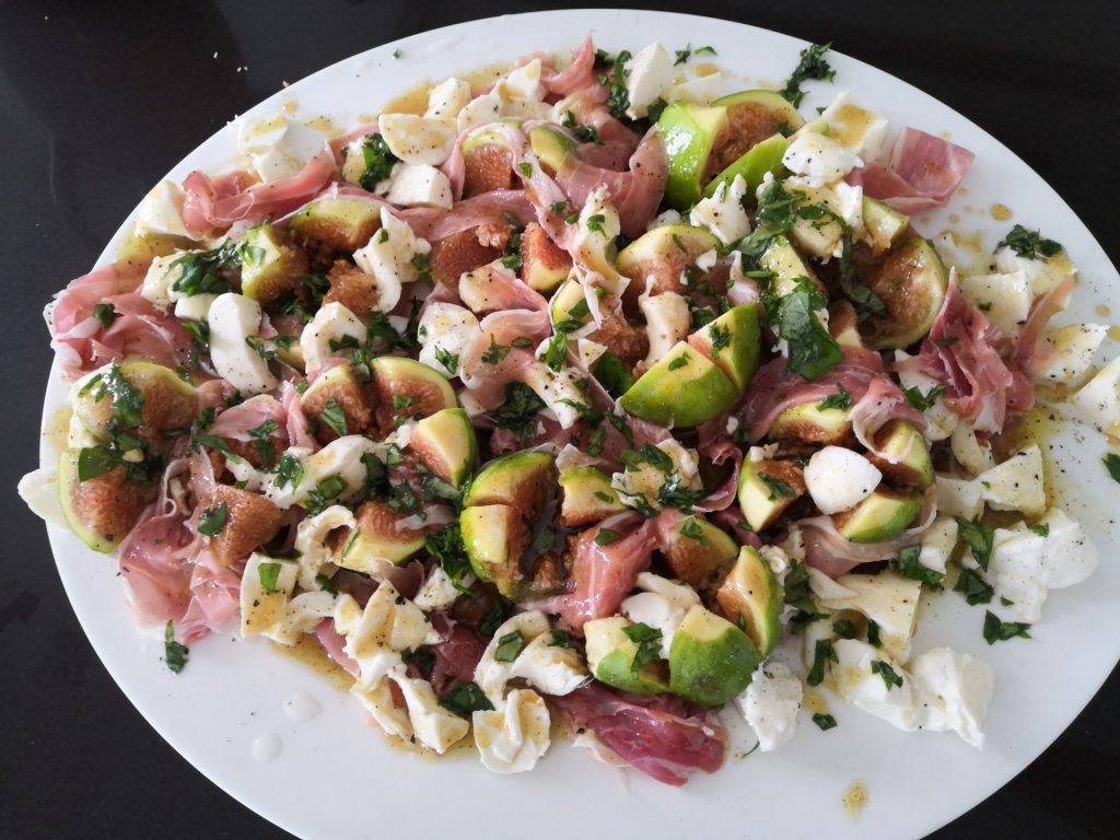 Ein Salat aus frischen, aromatischen Feigen, die mit salzigem Parmaschinken umwickelt werden. Milder, cremiger Mozzarella und ein Zitronen – Honig- Dressing sorgen für unvergleichlichen Genuss.