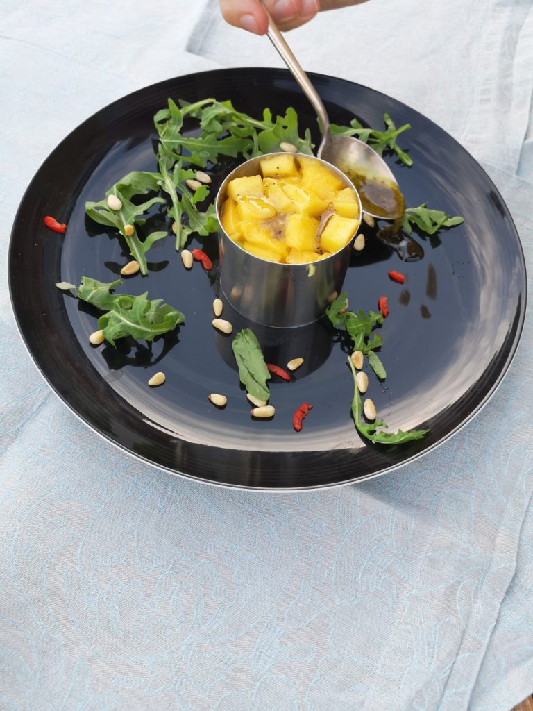 Das Dressing über den Avocado-Mozzarella-Mango- Turm träufeln und auch etwas davon auf dem Teller verteilen.