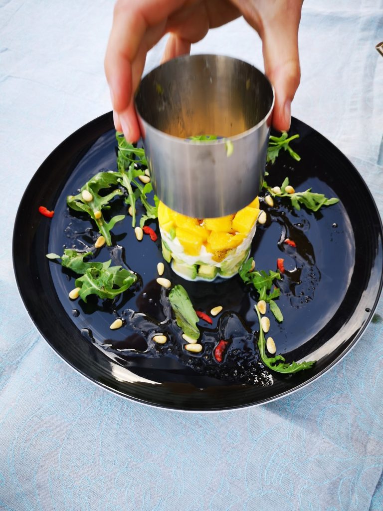 Einen Metallring/ Servierring auf einem Teller setzen. Unten eine Schicht Avocado einfüllen. Darauf eine Schicht Mozzarella geben und mit Mango schließen. Das Ganze mit einem Löffel leicht festdrücken.