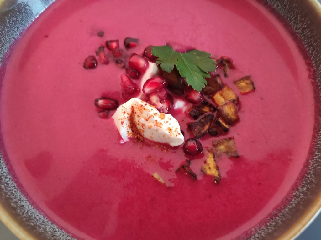 Ich richte die Suppe mit einem Klecks Ziegenfrischkäse oder Creme fraiche verrührt mit etwas Meerrettich an. Garniere mit Granatapfelkernen oder Würfeln kleinst geschnittener Kartoffel oder Süßkartoffel, die ich roh in der Pfanne scharf angebraten und gewürzt habe.